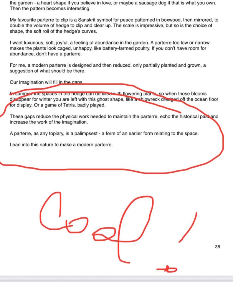 “This is, and I mean this as praise, a very unusual book. It’s specific enough to be used as a “how-to” guide by an aspiring topiary artist, yet general enoughto be picked up by a non-gardener, and enjoyed for the structure, style and joy of language and ideas. It offers technical advice, while also being abstract enough that many of its lessons could be applied to other creative disciplines such as writing, painting, directing etc.” Philip, non-gardener!